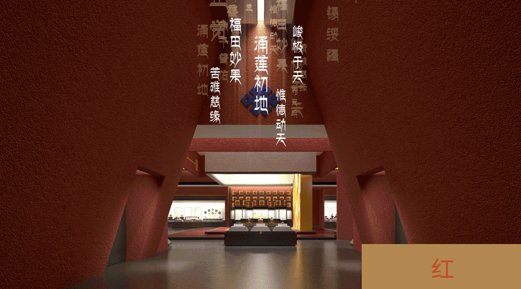 給紛繁璀璨藏文化最佳棲居所,給文化傳承發揚以空間。將吉祥結、阿嘎土、邊瑪墻、藏式建筑、轉經筒、布達拉宮等西藏特色文化元素融入展示空間,提取館藏代表性文物上的紋飾為設計元素。