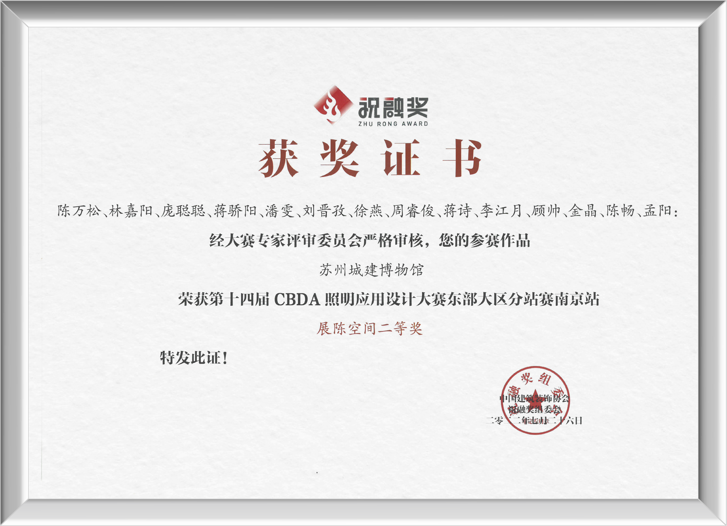 當晚的頒獎典禮上,組委會正式公布了2022年度祝融獎東部大區分站賽(南京)各空間獎項、佳作獎、優勝獎等榮譽。金螳螂文化憑借作品蘇州城建博物館榮獲展陳空間二等獎。